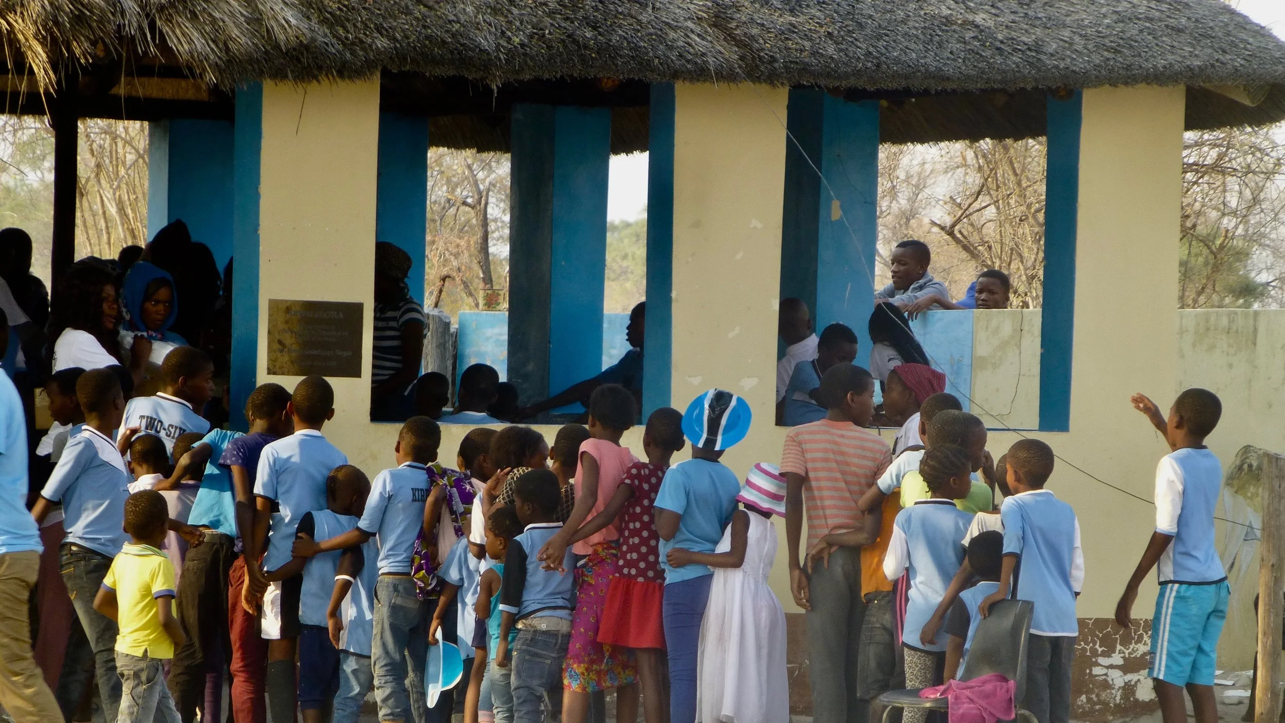The village celebrations were taking place at the Khwai Community Centre. Children were lined up to get their plates of food. No cutlery, as everyone was eating with their hands.