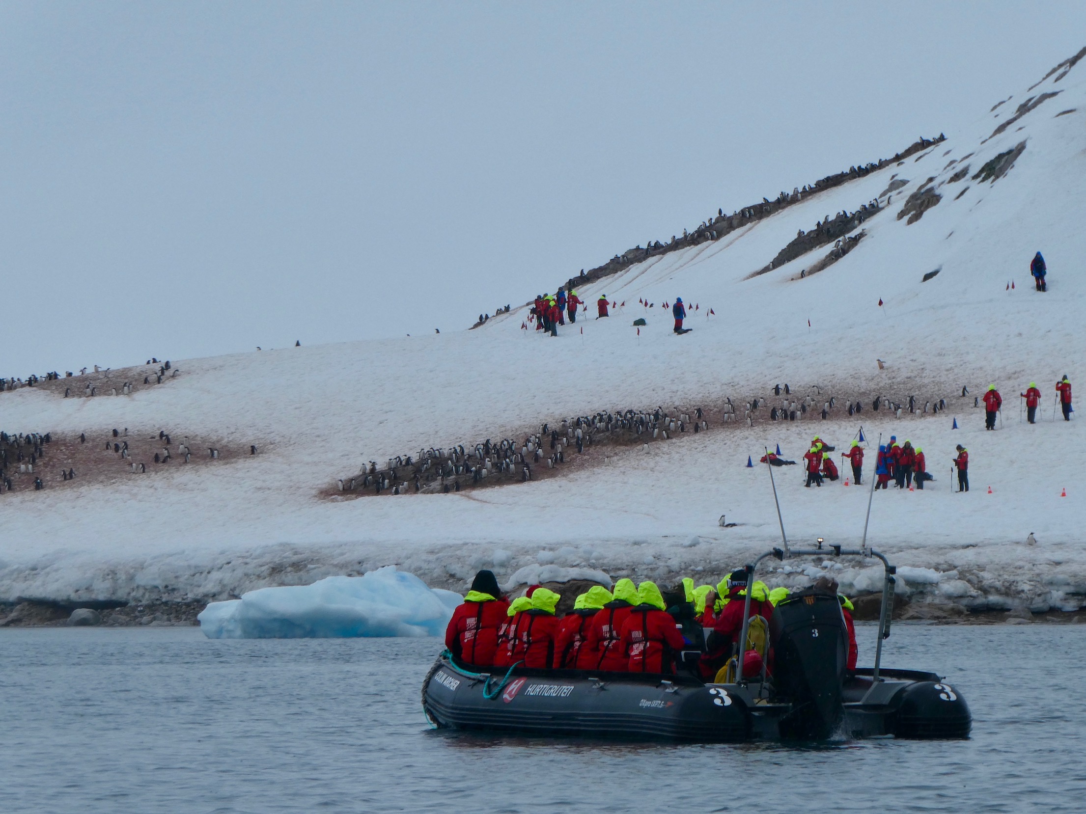 The expedition team arrives at the landing site well before you get there. Flags & orange cones mark where the passengers can walk and there is a limit of only 100 people on land at one time. Expedition team members keep an eye out for over zealous photographers. These observation barriers are established to insure passengers have the least impact on the rookery.
