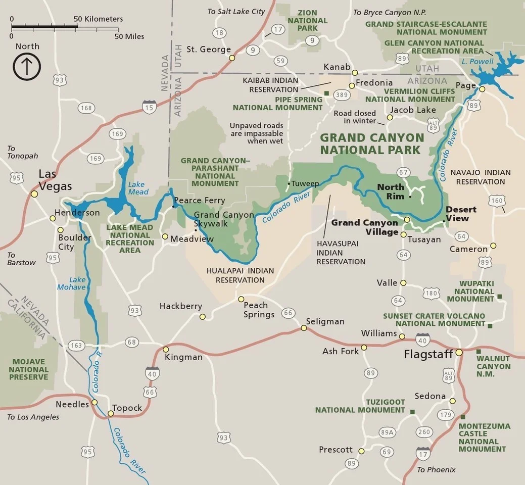 Map showing where Havasupai Indian Reservation is in comparison to Grand Canyon National Park.