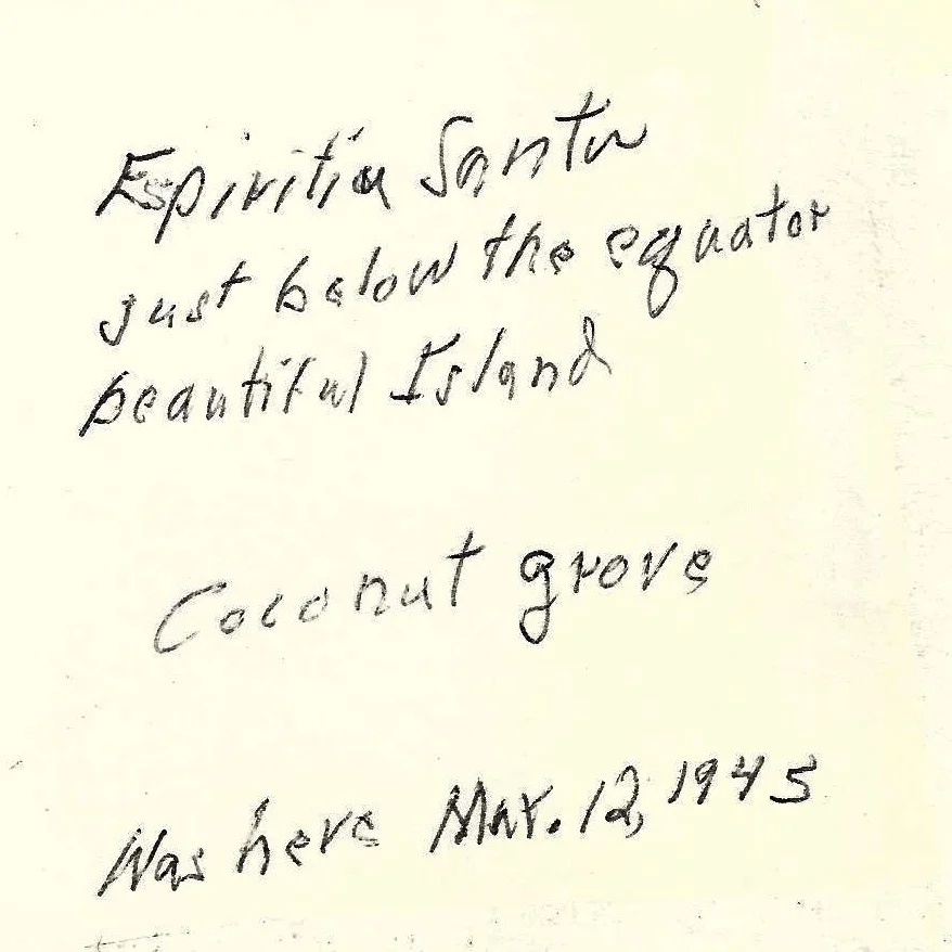 I was looking through a World War II scrapbook that belonged to Ed Gardiner, Kathy's father. It had very old black & white pictures and some small text of his time in the navy fighting in Europe and at the end in the Pacific. This is a note in his own hand writing of a place/beach he experienced in 1945. He was soon to head out towards Japan, to help end the war against the Japanese.
