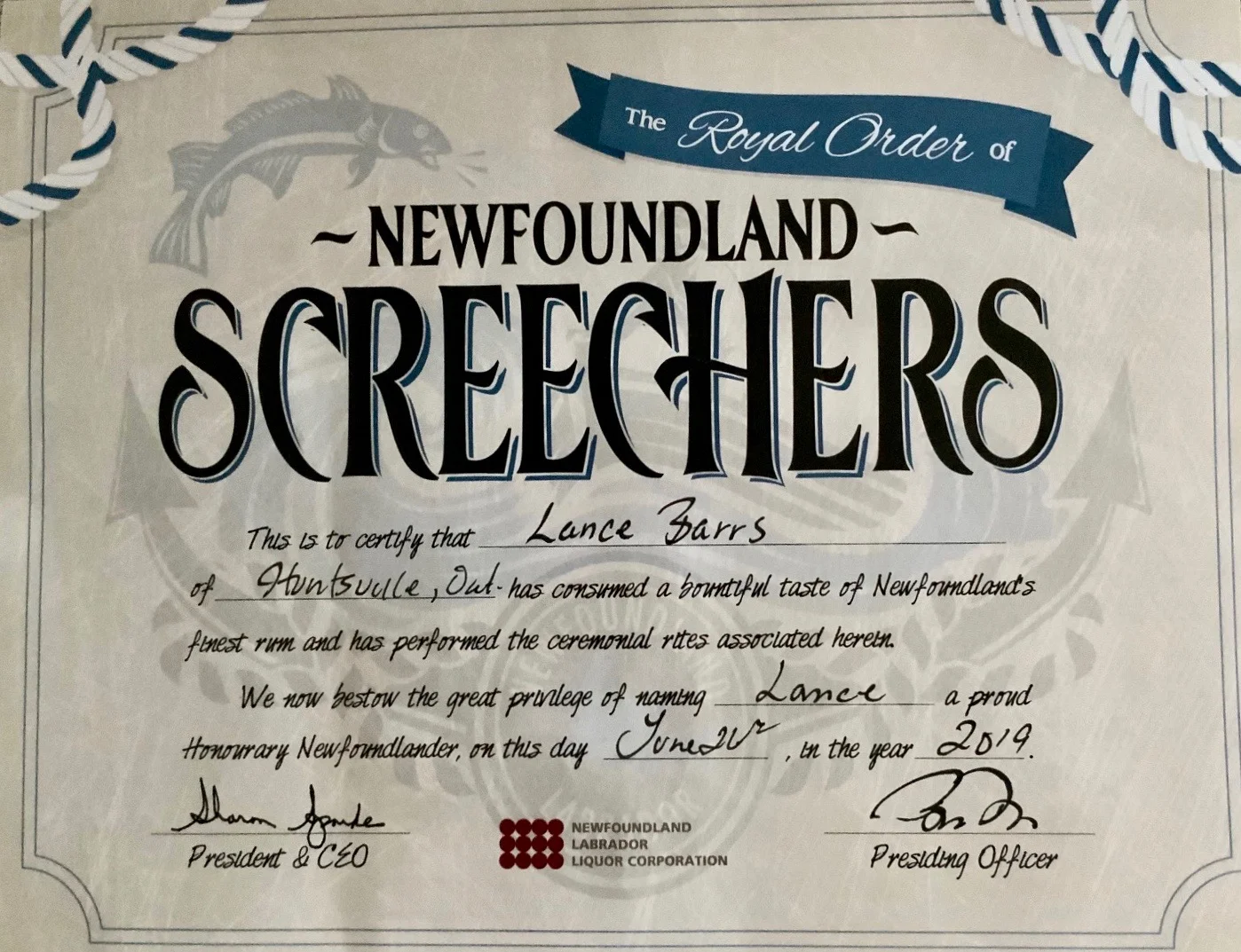is the only way to become an Honorary Newfoundlander. Every Newfoundlander knows what a Screech In Ceremony is all about. It is the only way that those not lucky enough to be born a Newfoundlander can become as close as possible to being a Newfoundlander. Those who survive the ceremony will be forever known as an Honorary Newfoundlanders.
